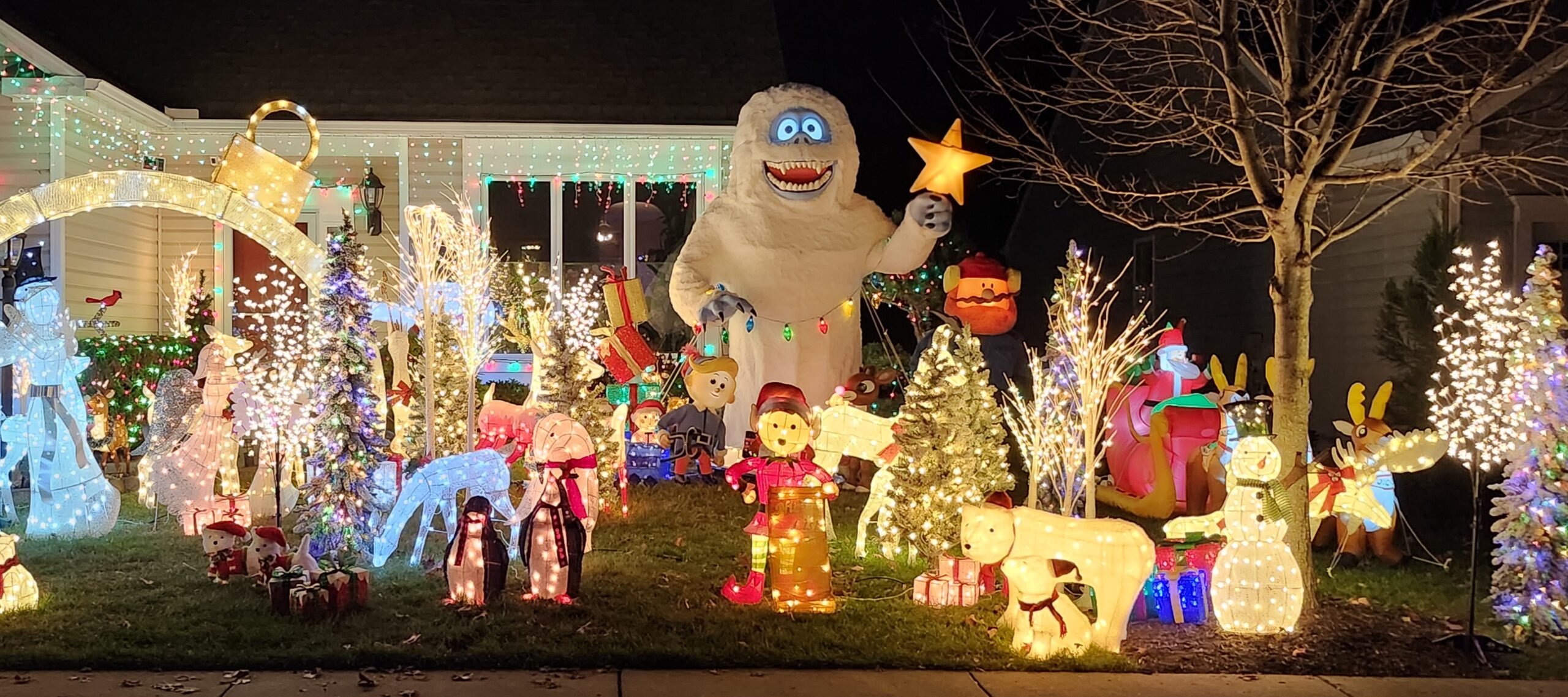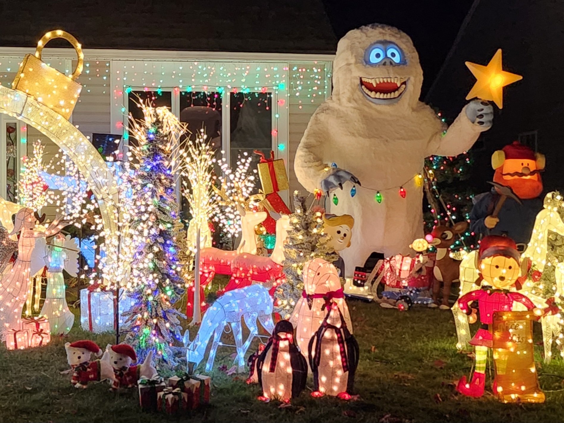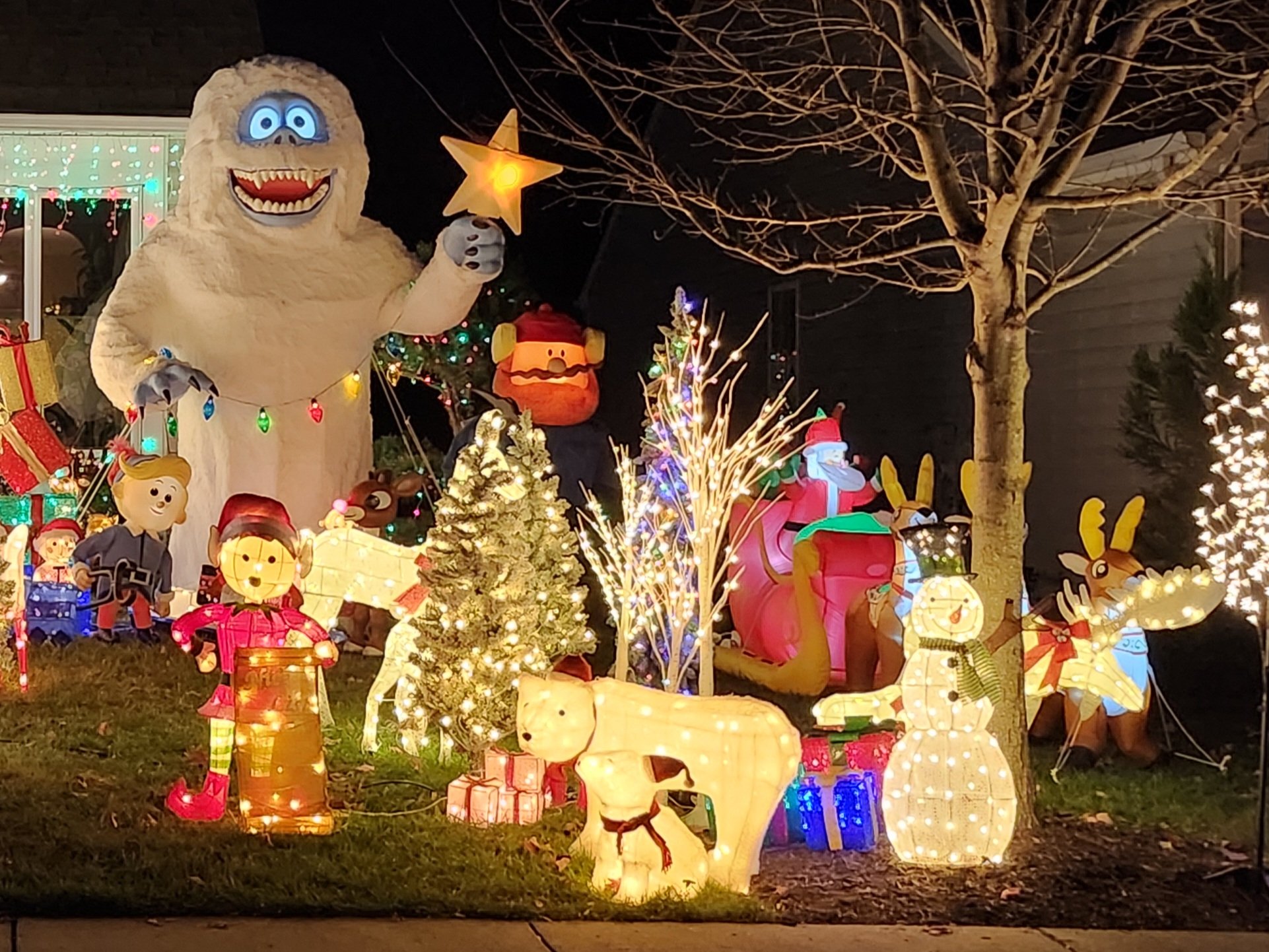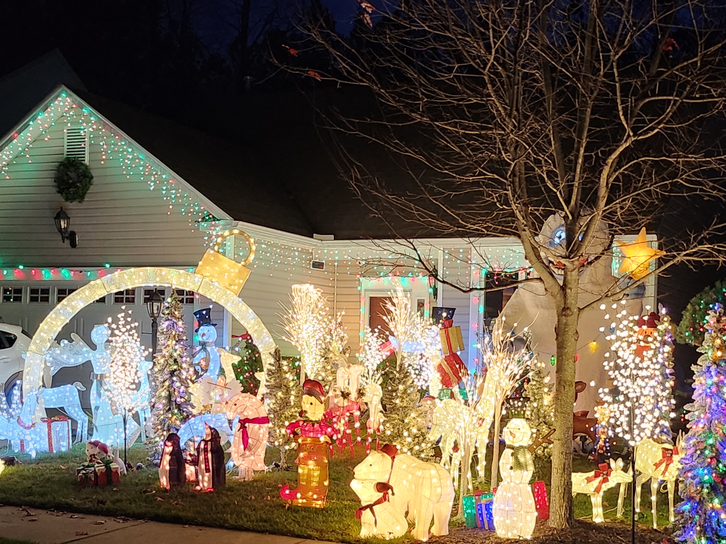 Very bright and cheerful. Snowmen, reindeer, polar bears etc. So much in a small yard. Music is great as well.